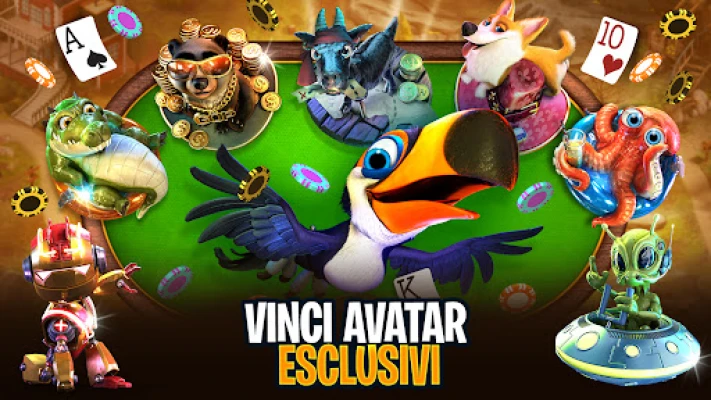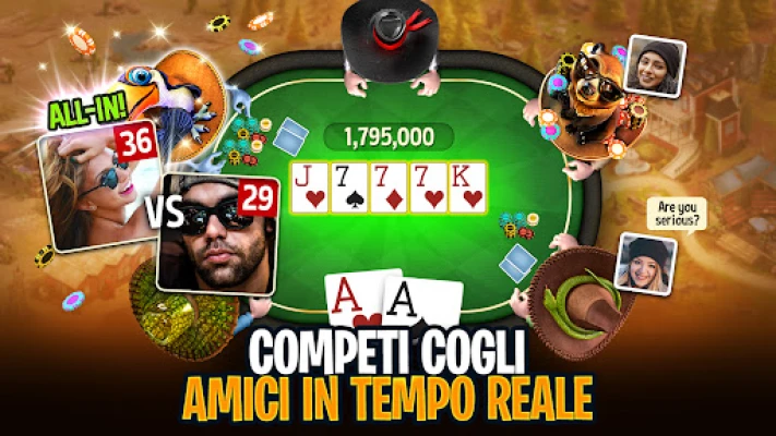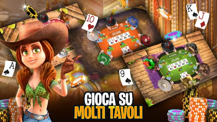 Ma il West di Governor of Poker 3 offre molto più del semplice poker. Metti alla prova le tue abilità con il classico Blackjack 21, lancia i dadi nella coinvolgente novità Chuck A Luck per sbloccare premi lungo il percorso, o tenta la fortuna alle slot e altri giochi di carte. Che tu preferisca l'azione rapida dei Sit & Go, la tensione degli Spin & Play, le sfide uno contro uno degli Heads Up, o le strategie di Push or Fold con Royal Poker, No-Limit e Pot-Limit, troverai sempre un tavolo su misura per te. Unisciti alla vivace community italiana, crea o entra a far parte di squadre, affronta missioni e competi in entusiasmanti tornei PvP con amici e nuovi alleati. Giocare online con compagni di squadra rende ogni mano ancora più avvincente.
