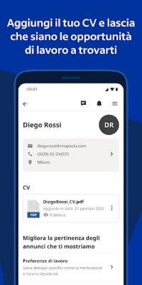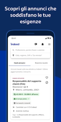 Indeed semplifica ogni fase del tuo percorso di candidatura. Che tu preferisca caricare il tuo CV esistente o crearne uno impeccabile con il nostro generatore integrato, Indeed ti permette di presentare al meglio le tue competenze. Le tue informazioni vengono salvate in modo sicuro, rendendo ogni nuova candidatura un processo rapido e senza sforzo. Ma Indeed non si limita a mostrarti le offerte: grazie ai nostri algoritmi intelligenti, ti propone opportunità su misura, basate sulla tua esperienza pregressa e sulle tue preferenze, portandoti direttamente ai ruoli che contano davvero per te.