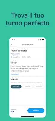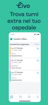 Per i professionisti infermieristici, Livo Interno dischiude un nuovo orizzonte di libertà e flessibilità. Non più vincoli rigidi o compromessi tra vita professionale e personale. Grazie a Livo Interno, hai il pieno controllo della tua agenda: scegli i turni che si armonizzano perfettamente con le tue esigenze e il tuo stile di vita, direttamente dall'applicazione. È un sistema di gestione chiaro, immediato ed estremamente efficace, progettato per offrirti la serenità di una pianificazione che ti rispecchia.