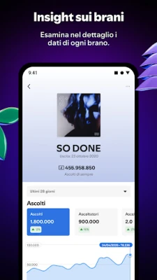 Immergiti nelle statistiche vitali per decifrare chi ascolta la tua musica, da dove proviene il tuo pubblico e quali brani risuonano di più. Con una visione chiara sulle performance dei tuoi pezzi nelle playlist e sui flussi di ascolto in tempo reale, potrai celebrare ogni successo: dal raggiungimento di nuovi traguardi di follower agli inserimenti nelle playlist più ambite. Spotify for Artists trasforma i dati grezzi in informazioni preziose, guidandoti verso decisioni strategiche per la tua crescita artistica.