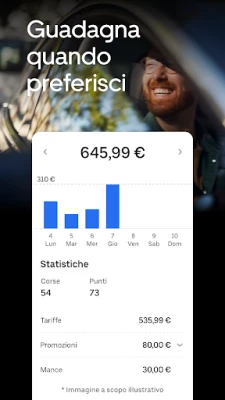Guadagna nel tempo libero con Uber Driver. L'app per autisti progettata per offrirti massima flessibilità e gli strumenti per avere successo. Aiuta persone e ordini a destinazione, guida quando vuoi, senza capi né orari fissi, monitorando i tuoi guadagni facilmente.